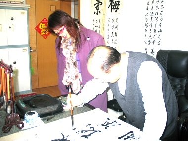 周局长率领我们参观自己的别墅.参观到二楼,看到一间书房,里面是写书法的大案子,我就要求周局长给我们提字.