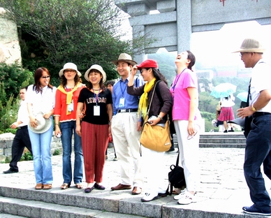 (图为参加泰山笔会的部分代表神彩飞扬地想在泰山留个影。他们是人民文学刘会军、国门时报华静、中国石油报毛竹、经济日报初志英等。猜猜那个拿相机准备拍照的是哪一位?)